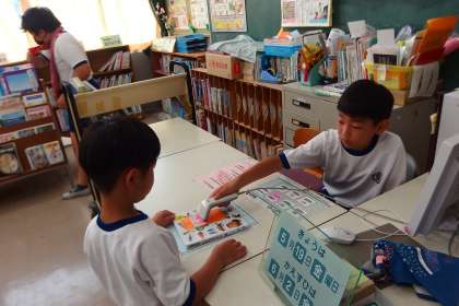 図書システム用のパソコンを操作して、貸し出しや返却の手続きの仕事をする図書委員です。