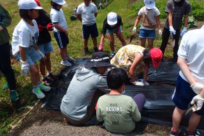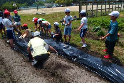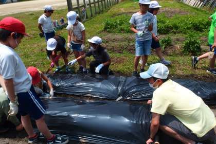サツマイモの苗植えに向けて、4年生がマルチシートを設置してくれました。