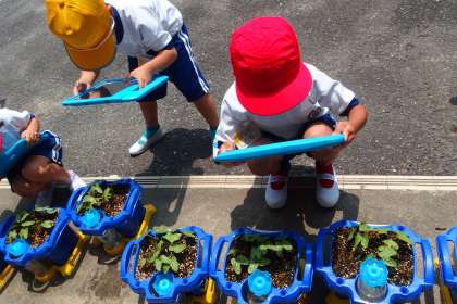 アサガオの成長の様子をタブレットで撮影している1年生です。