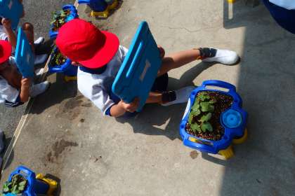 アサガオの成長の様子をタブレットで撮影している1年生です。
