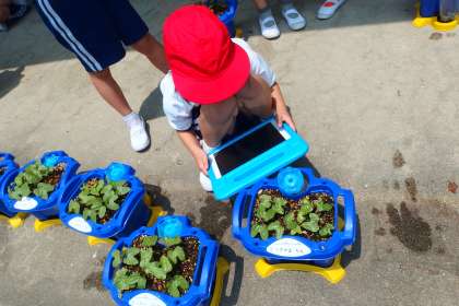 アサガオの成長の様子をタブレットで撮影している1年生です。