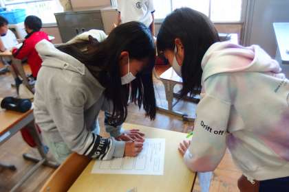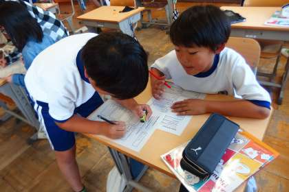 5年生の英語の授業です。 会話のアクティビティーで友だちと語り合い、教え合い、学び合い。