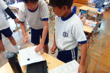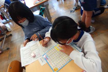 5年生の英語の授業です。 会話のアクティビティーで友だちと語り合い、教え合い、学び合い。