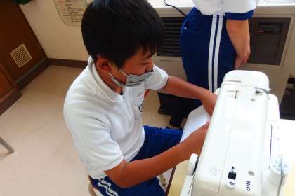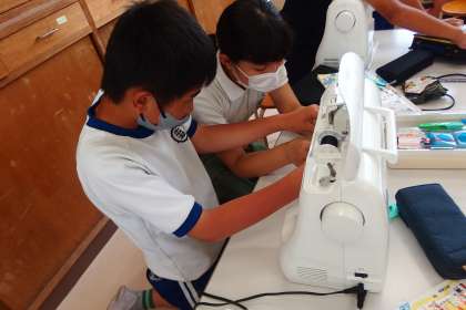 ミシンに初めて触れる児童も多く、ボビンの用意、上糸の取り回しなど、話し合い、さぐりあい、学び合いで手順を確認していました。