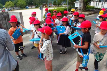 運動場に出て、生き物の写真をタブレットで撮影します。