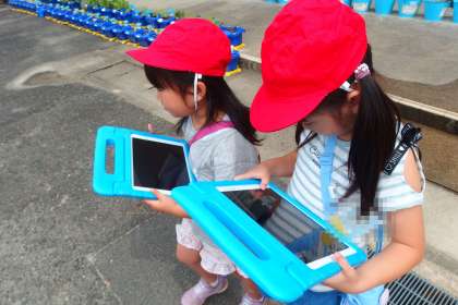 1年生の生活科の授業です。 運動場に出て、生き物の写真をタブレットで撮影しています。