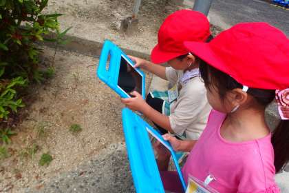 運動場に出て、生き物の写真をタブレットで撮影しています。
