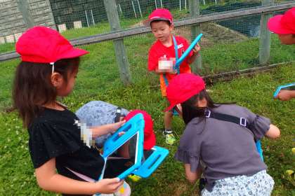 運動場に出て、生き物の写真をタブレットで撮影しています。
