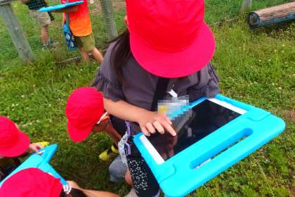 運動場に出て、生き物の写真をタブレットで撮影しています。