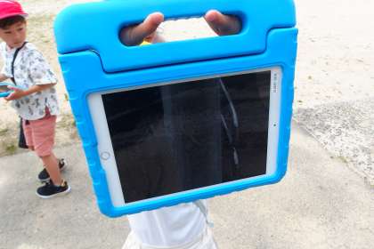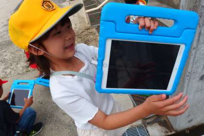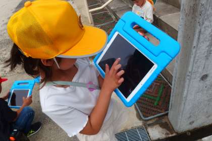 1年生の生活科の授業です。 運動場に出て、生き物の写真をタブレットで撮影しています。
