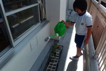 1年生、2年生、3年生とは違い、4年生は教室のテラスでツルレイシ(ゴーヤ)を栽培しています。