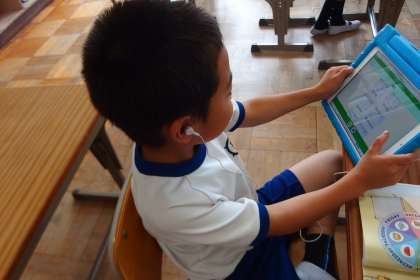 4年生の外国語活動の授業です。 タブレット内の資料を活用して読みの練習をしています。