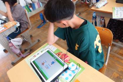 タブレット内のデジタル教科書を使って読みの練習をしています。