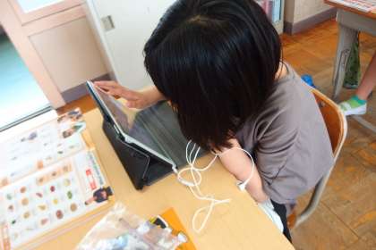 タブレット内のデジタル教科書を使って読みの練習をしています。