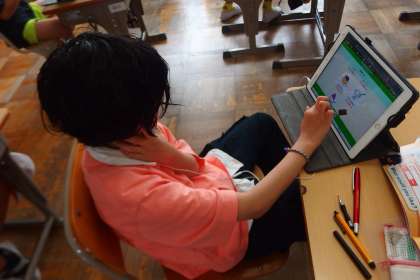 タブレット内のデジタル教科書を使って読みの練習をしています。