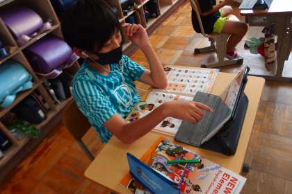 タブレット内のデジタル教科書を使って読みの練習をしています。