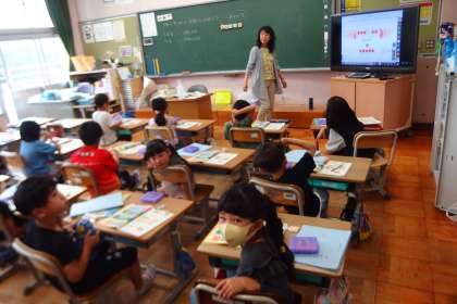 先生がタブレットからデジタル教科書を提示して計算の仕方を開設しています。