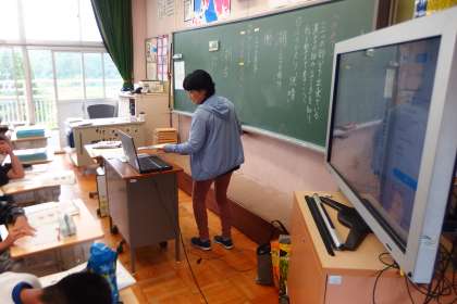 お手本と書き方のコツをノートパソコンから電子黒板に映し出しています。