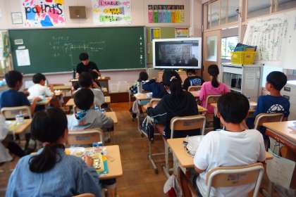 6年生が給食を食べながら楽しくお勉強。