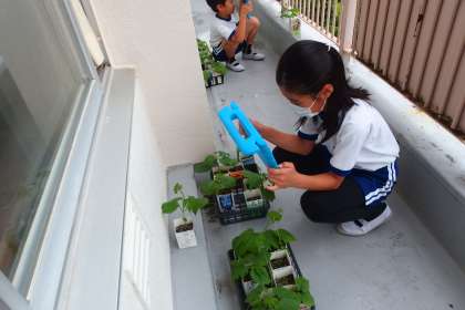 4年生の理科の授業で記入しているツルレイシ(ゴーヤ)の栽培日記のために、写真をタブレットで撮影して貼り付けています。