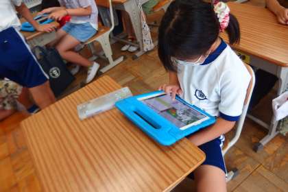 タブレットで復習をしている4年生です。