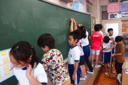 授業参観を前にして、黒板をピカピカに磨き上げる技を競い合っている4年生です。