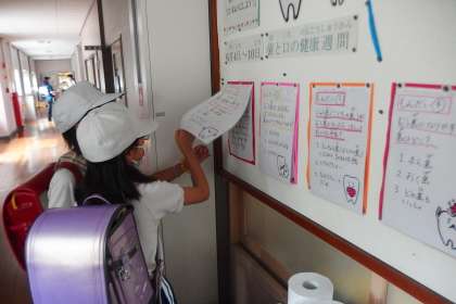 保健室前の6月の掲示(歯と口の健康)をペラっとめくってお勉強。 これもかわいい学び合いの姿。