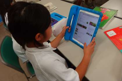 図書室の書籍とタブレットを活用して身近な生き物のことを調べていました。