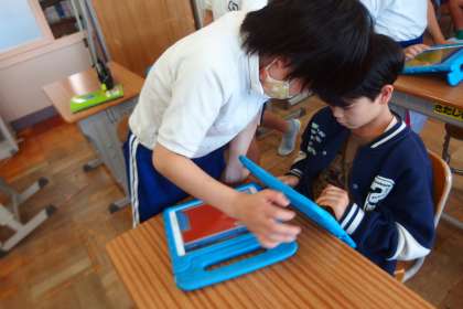 4年生の外国語活動の授業です。 英会話活動のサポートのためにタブレットを活用しています。