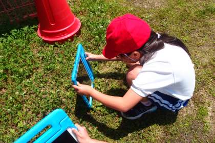3年生の理科の授業です。 夏の生き物を見つけて、タブレットで撮影していました。
