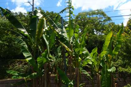 夏の日ざしを浴びてバナナが元気に葉を茂らせ始めました。
