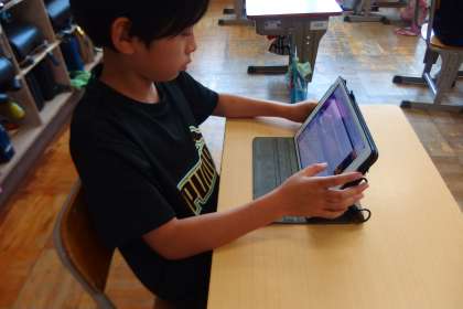 QRコードを読み取ってタブレットでformsを開き、アンケートに答えているところです。