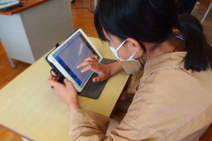 QRコードを読み取ってタブレットでformsを開き、アンケートに答えているところです。