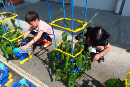 アサガオの世話をする1年生です。