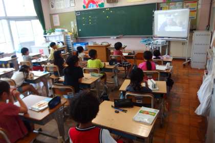 2年生の国語の授業です。 デジタル教科書を手本にして読み方の練習をしています。