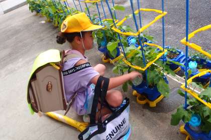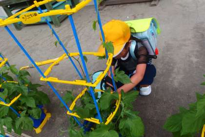 アサガオの世話をする1年生です。 みんなで支え合い、学び合いです。