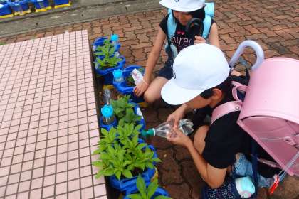 朝のルーティンの水やりをしている3年生です。