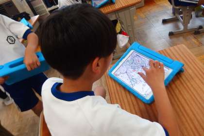 自分たちの住んでいる学区、地域の防災マップをタブレットで確認し合いました。