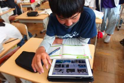一人一人が決めた国について、その国の食べ物や見るべきものをタブレットを使って調べて、教科書に英文を書き込んでいきました。