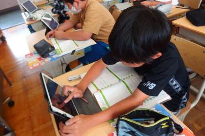 6月26日の東広瀬小学校(23) 公開日 2023/06/27 更新日 2023/06/27 活動の様子 6年生の英語の授業です。 一人一人が決めた国について、その国の食べ物や見るべきものをタブレットを使って調べて、教科書に英文を書き込んでいきました。