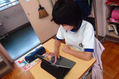 5年生の英語の授業です。 デジタルドリル(Qubena)で復習をしているところです。