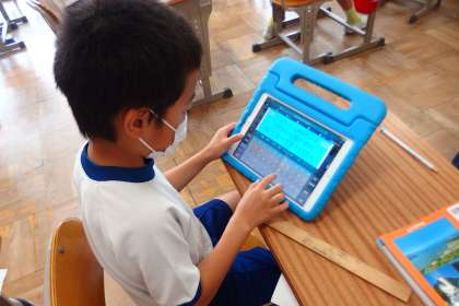 計算の進め方を考え、タブレットに記入していました。