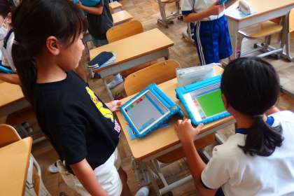 7月4日の東広瀬小学校(69) 公開日 2023/07/08 更新日 2023/07/08 活動の様子 3年生の外国語活動の授業です。 色の英語表現を学習しています。 タブレットを利用してインタビューゲームをしているところです。