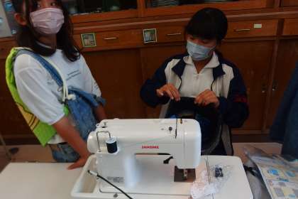 旧友との共同作業、学び合い、教え合いで修学旅行に持参するバッグを作っています。