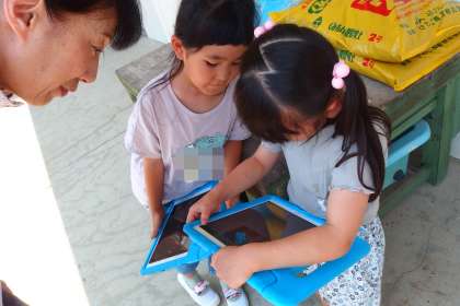 栽培しているアサガオの写真をタブレットで撮影しています。