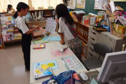 図書システム用のパソコンを操作して、貸し出しや返却の手続きの仕事をする図書委員です。