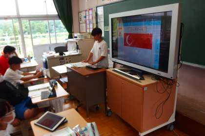 7月5日の東広瀬小学校(68) 公開日 2023/07/10 更新日 2023/07/10 活動の様子 6年生の英語の授業です。 一人一人が調べた国のことをタブレットにまとめました。 それを発表しているところです。
