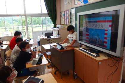 7月5日の東広瀬小学校(69) 公開日 2023/07/10 更新日 2023/07/10 活動の様子 6年生の英語の授業です。 一人一人が調べた国のことをタブレットにまとめました。 それを発表しているところです。