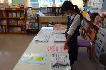 図書システム用のパソコンを操作して、貸し出しや返却の手続きの仕事をする図書委員です。
