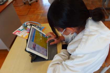 5年生の英語の授業です。 タブレットの発表ノートに英語スピーチ原稿を書き込んでいます。